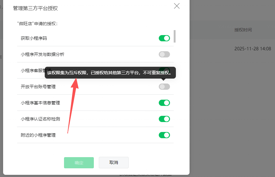 就是微信开放平台(open.weixin.qq.com) 绑定的开发小程序的“该权限集为互斥权限,已授权给其他第二方平台,不可重复授权,”