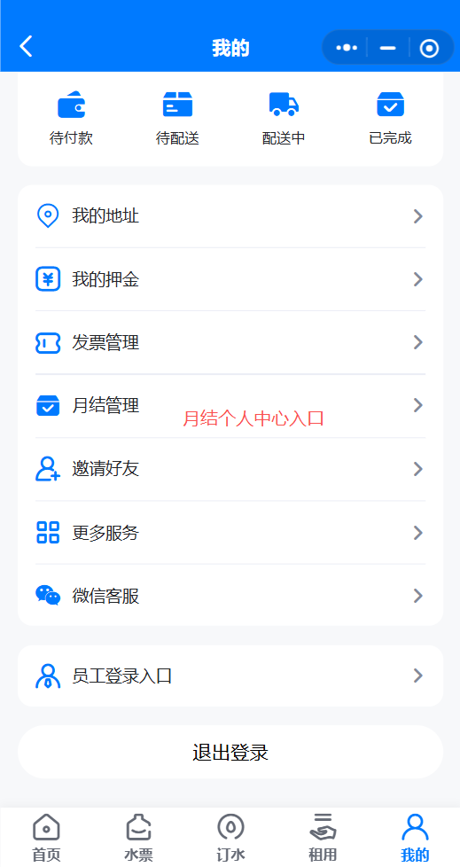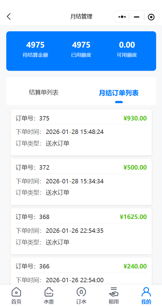 4、个人中心入口:进去之后可以看到对应的可用额度、待还额度、已使用额度,以及用月结小费的订单,支付方式上会出现月结。
