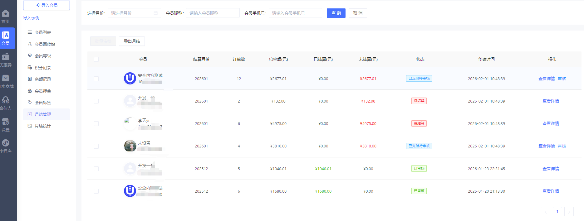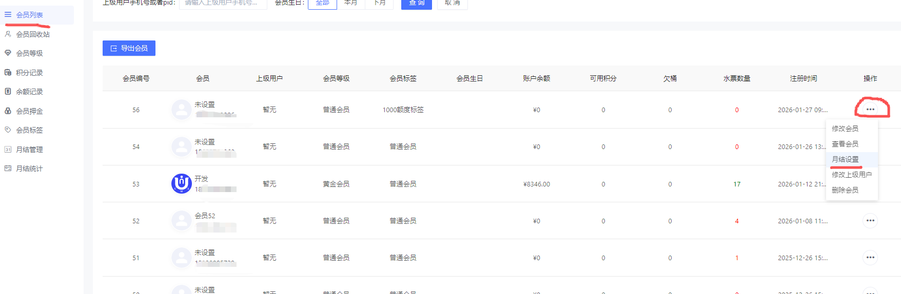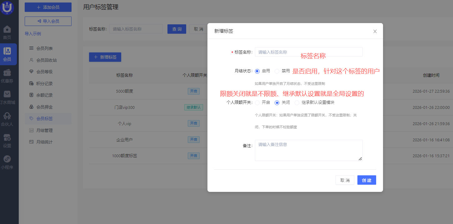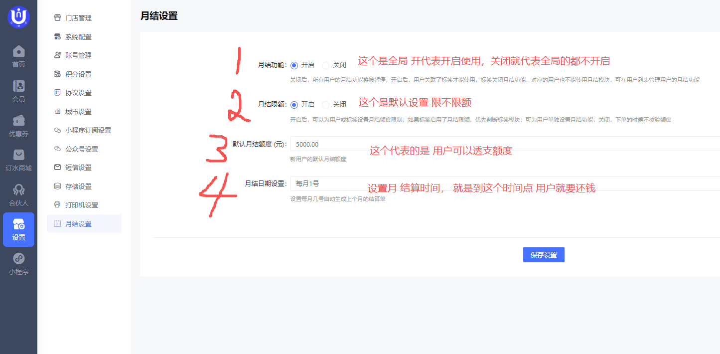 月、结功能:就是有点类似花呗功能,客户可以提前透支,下个月归还,如果不归还就不能使用月结功能, 总后台会有待结算列表,总后台可以统一设置, 也可以会员设置不同标签透支额度不一样,还可以单独给某个会员设置不一样额度。