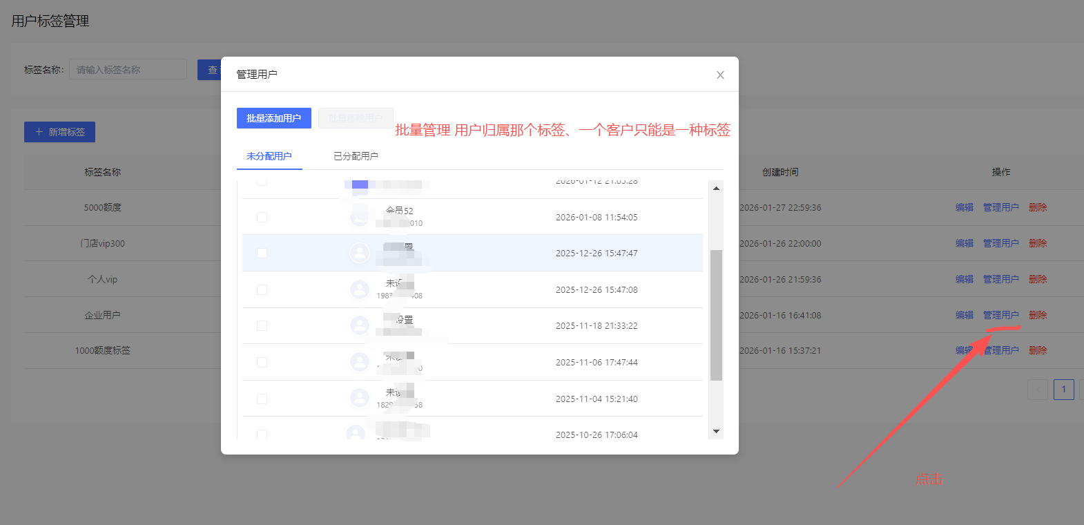 3、点击用户管理可以批量管理用户归属, 一个用户只能归属一个标签,也可以在用户列表中设置客户归属哪个标签